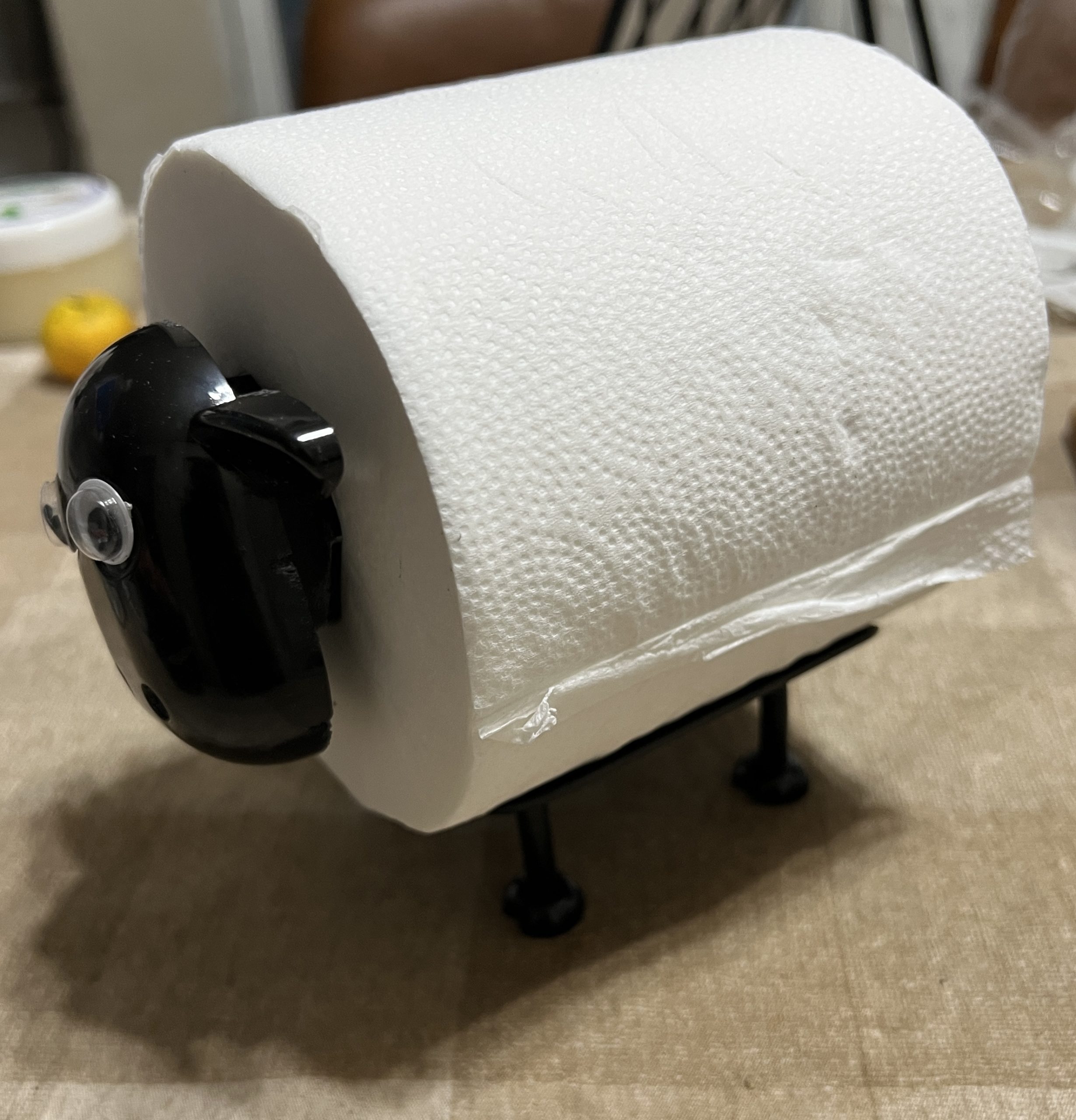 今回の修理品(?)は、トイレットペーパーに顔を差し込んで足の台座に載せる飾り(?)です。